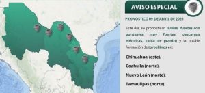 Ciudad Victoria, Tamaulipas.- La Coordinación Nacional de Protección Civil alertó que durante este día se esperan lluvias de fuertes