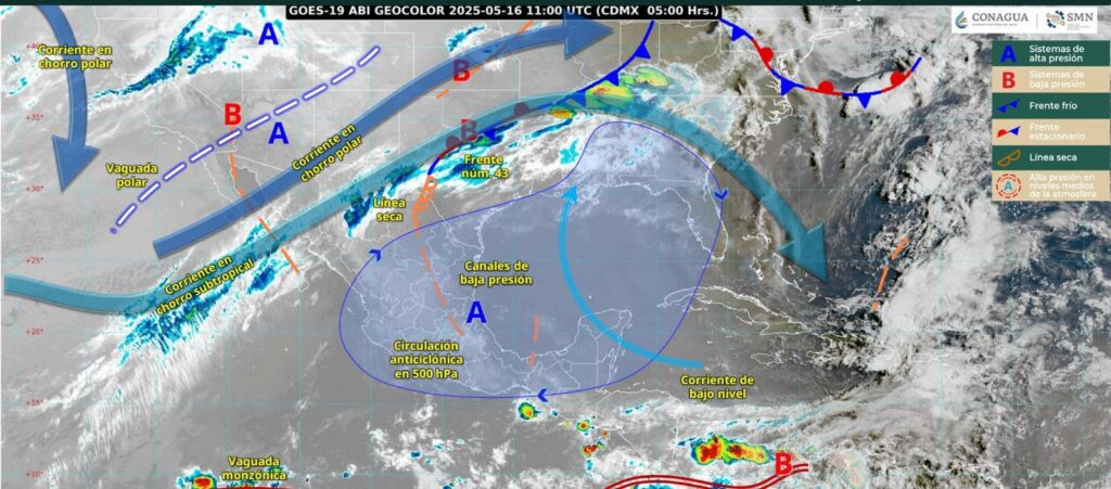 Finalmente, señaló el SMN de la Conagua, una circulación anticiclónica en niveles medios de la atmósfera y el bajo contenido de humedad, mantendrán ambiente caluroso a muy caluroso sobre la República Mexicana, prevaleciendo la onda de calor en Sinaloa, Nayarit, Jalisco, Colima, Michoacán, Guerrero, Oaxaca, Chiapas (centro y oeste), Durango (noreste, este y sur), Coahuila (centro y sur), Nuevo León (centro y sur), Tamaulipas (centro, oeste y suroeste), San Luis Potosí, Zacatecas, Aguascalientes, Guanajuato, Querétaro, Hidalgo (oeste y suroeste), Tlaxcala, Estado de México (norte y suroeste), Ciudad de México, Morelos, Puebla (sur y suroeste), Veracruz (centro y sur), Tabasco, Campeche y Yucatán (suroeste).