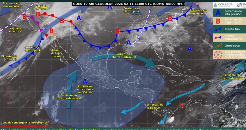 Ciudad Victoria, Tamaulipas .- Para hoy, un anticiclón en niveles medios de la atmósfera mantendrá tiempo estable, baja probabilidad de lluvia y ambiente cálido a caluroso sobre la mayor parte del territorio nacional.