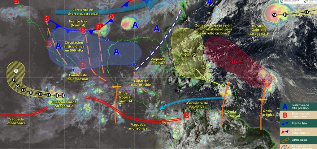 La onda tropical número 34 recorrerá el sureste y sur del país, ocasionará lluvias puntuales intensas en Oaxaca y Guerrero; y puntuales muy fuertes en Chiapas. Un canal de baja presión y una vaguada en altura sobre la Península de Yucatán, generarán lluvias puntuales muy fuertes en Yucatán y Campeche; y puntuales fuertes en Quintana Roo, advirtió el SMN de la Conagua.