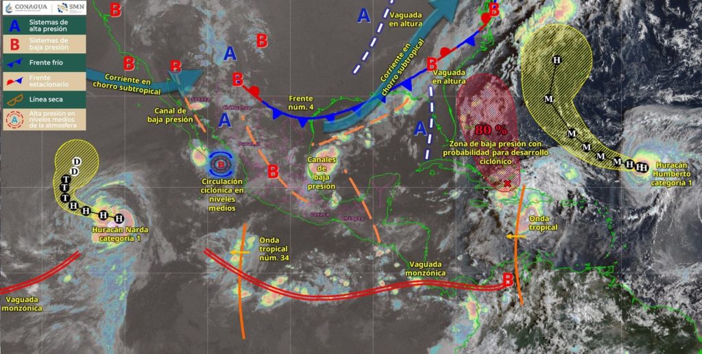 Por su parte, la onda tropical número 34 que se desplazará al sur de las costas de Jalisco, sin generar efectos en el territorio nacional, mientras que el huracán Narda, alejado de costas nacionales, mantendrá oleaje elevado en la costa occidental de Baja California Sur.