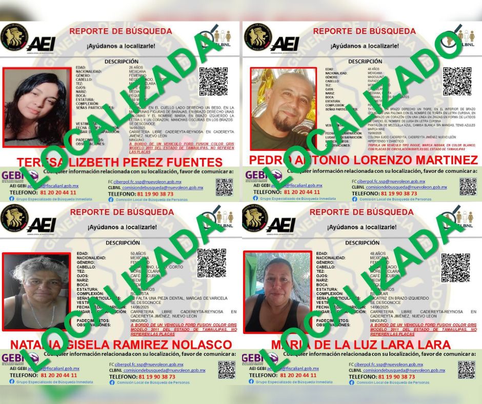 General Terán, N.L.- Tras varios días de intensa búsqueda, la Fiscalía General de Justicia de Nuevo León confirmó este jueves la localización con vida del enfermero Pedro Antonio Lorenzo Martínez, trabajador del IMSS en Reynosa, y de tres mujeres que habían sido reportadas como desaparecidas desde el pasado fin de semana.