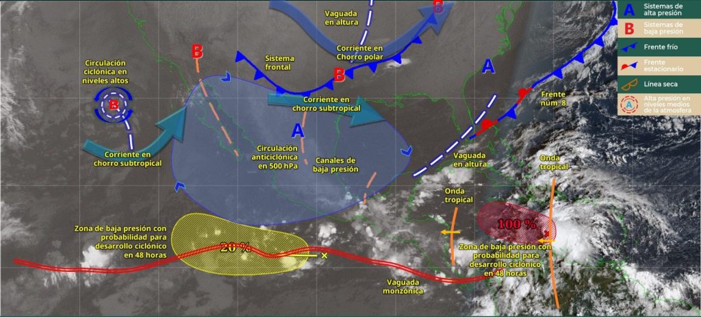 Finalmente, una circulación anticiclónica en niveles medios de la atmósfera sobre la Mesa del Norte, ocasionará una baja probabilidad de lluvias en dicha región, además de la Mesa Central y el noreste del país.
