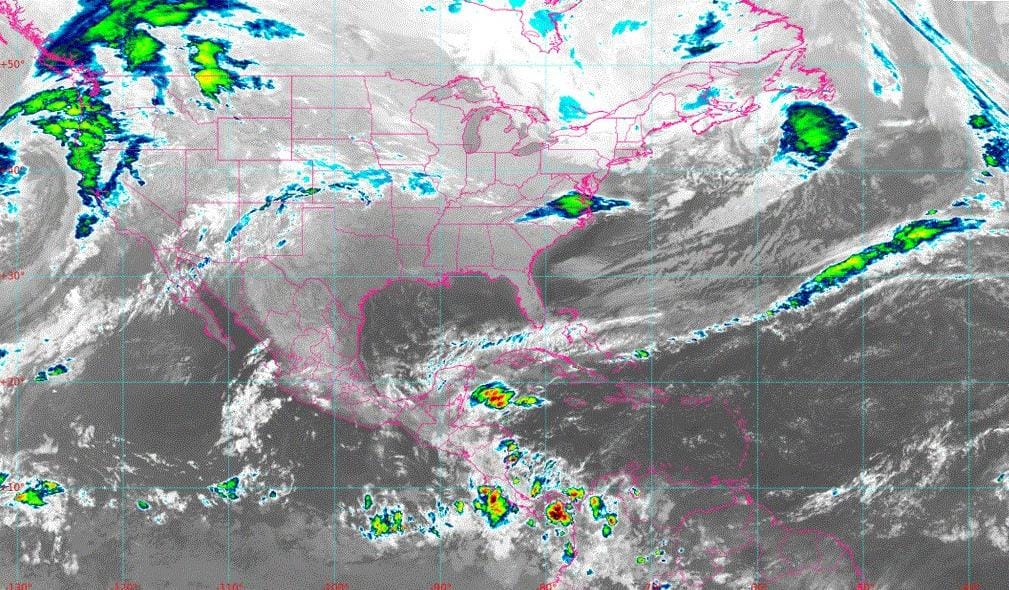 Ciudad Victoria, Tamaulipas . – Para hoy, un canal de baja presión se extenderá sobre el occidente del Mar Caribe, interaccionará con el ingreso de humedad e inestabilidad atmosférica, originando lluvias puntuales torrenciales con posibles trombas marinas en Quintana Roo (sur), así como lluvias muy fuertes en Campeche, y chubascos en Yucatán; dichas lluvias estarán acompañadas con descargas eléctricas, así como originar encharcamientos e inundaciones.