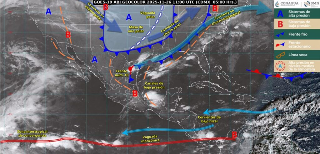 Ciudad Victoria, Tamaulipas. – Este día, el frente frío número 16 será reforzado por una masa de aire polar, por lo que se desplazará sobre el noreste y oriente del territorio nacional, y en interacción con un canal de baja presión sobre el suroeste del Golfo de México y el sureste mexicano, ocasionarán lluvias fuertes a muy fuertes en el noreste, oriente y sureste del país, incluida la Península de Yucatán, informó el Servicio Meteorológico Nacional.