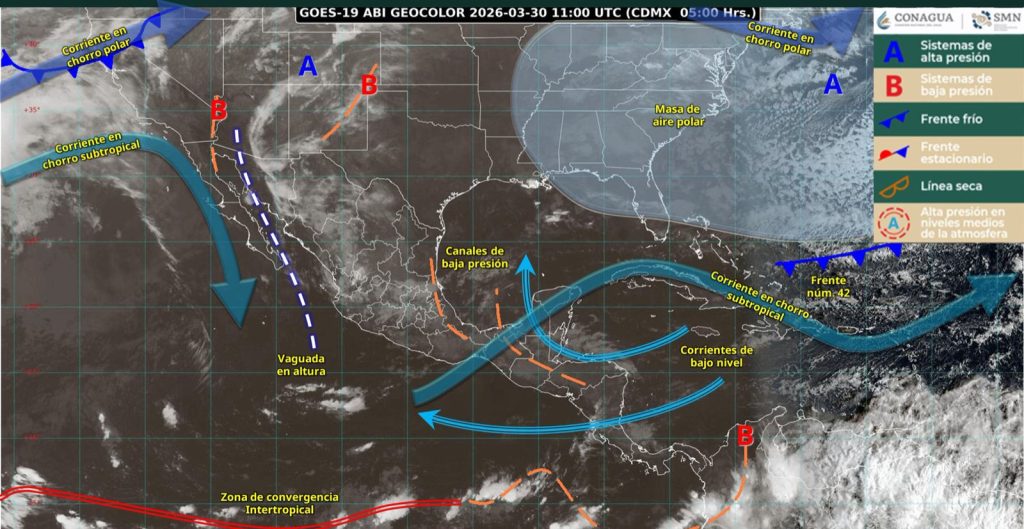 Ciudad Victoria, Tamaulipas.- Este día, una circulación de baja presión en niveles medios y una vaguada en altura se desplazarán sobre el occidente y norte de México, en interacción con canales de baja presión en el interior del país, y la corriente en chorro subtropical, ocasionarán chubascos y lluvias fuertes con descargas eléctricas, rachas de viento y descenso de temperatura en estados del oriente, sur y sureste del país, incluida la Península de Yucatán; y con posible caída de granizo en estados del norte, occidente y centro del territorio nacional.
