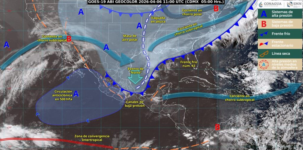 La masa de aire polar asociada al frente mantendrá el evento de “Norte” con rachas de viento de 60 a 80 kilómetros por hora en Tamaulipas, Veracruz e Istmo y Golfo de Tehuantepec; así como el descenso de las temperaturas en el norte, centro y oriente del territorio nacional.