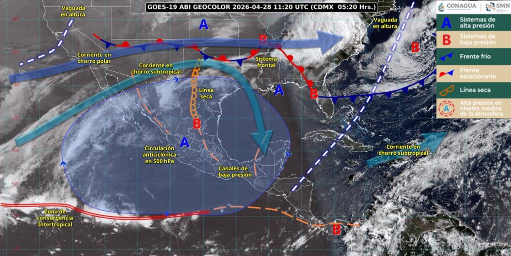 A su vez, en el noreste mexicano, una línea seca y la corriente en chorro subtropical, ocasionarán lluvias con chubascos y rachas fuertes de viento en Nuevo León, Tamaulipas y San Luis Potosí, además de probabilidad de formación de torbellinos en el norte de Coahuila.