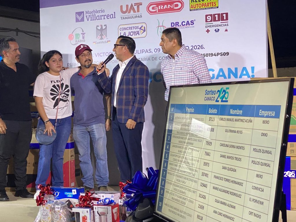Ciudad Victoria, Tamps.– La Cámara Nacional de Comercio (CANACO) llevó a cabo con éxito la clausura del Sorteo CANACO 2025, un evento que reconoció la preferencia de los clientes del comercio local y fortaleció la economía de la ciudad, con un valor total en premios de 393 mil pesos.