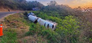 Antiguo Morelos, Tamaulipas.– Elementos de la Guardia Estatal de Apoyo Carretero atendieron la volcadura de un tractocamión tipo pipa